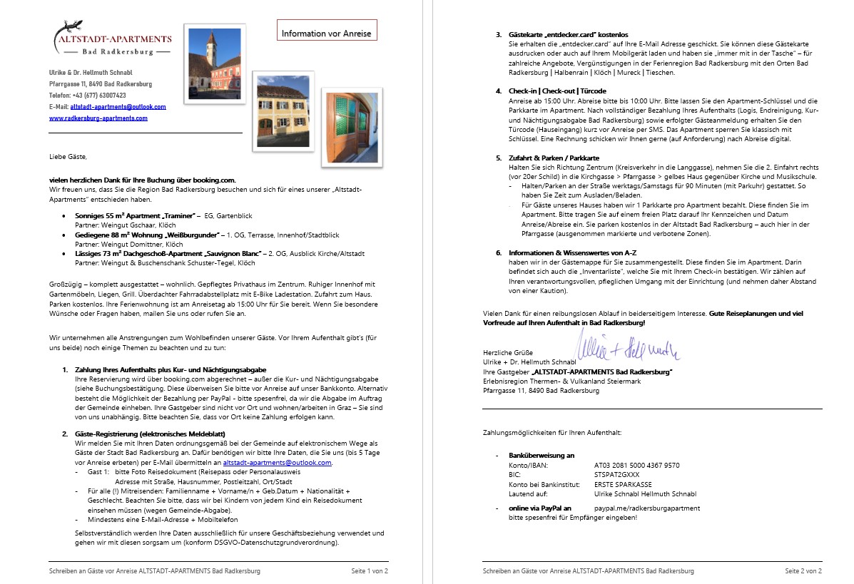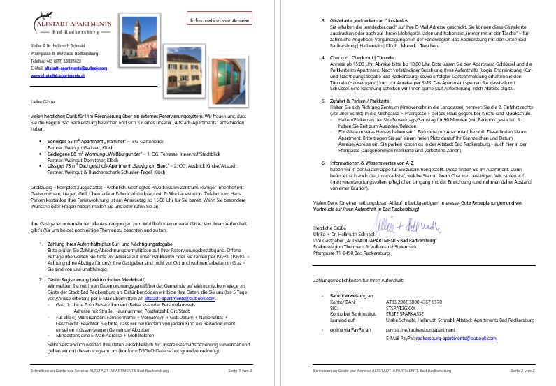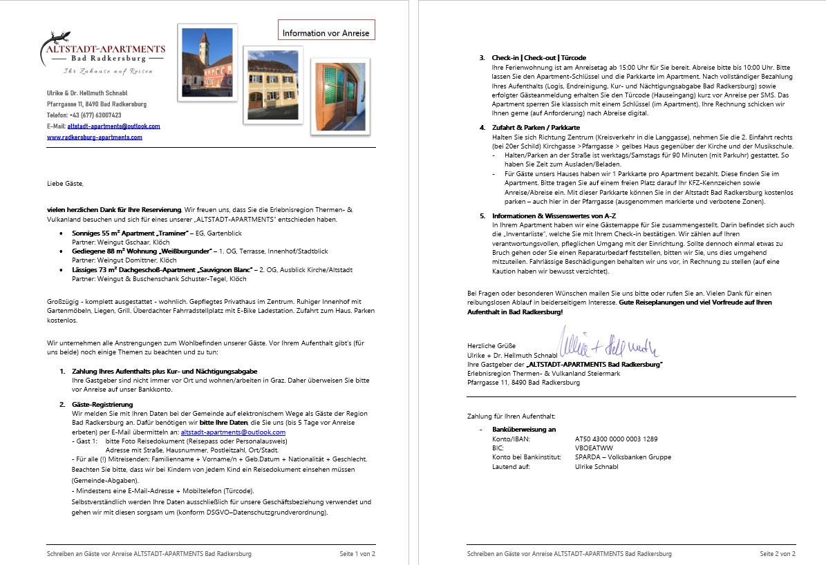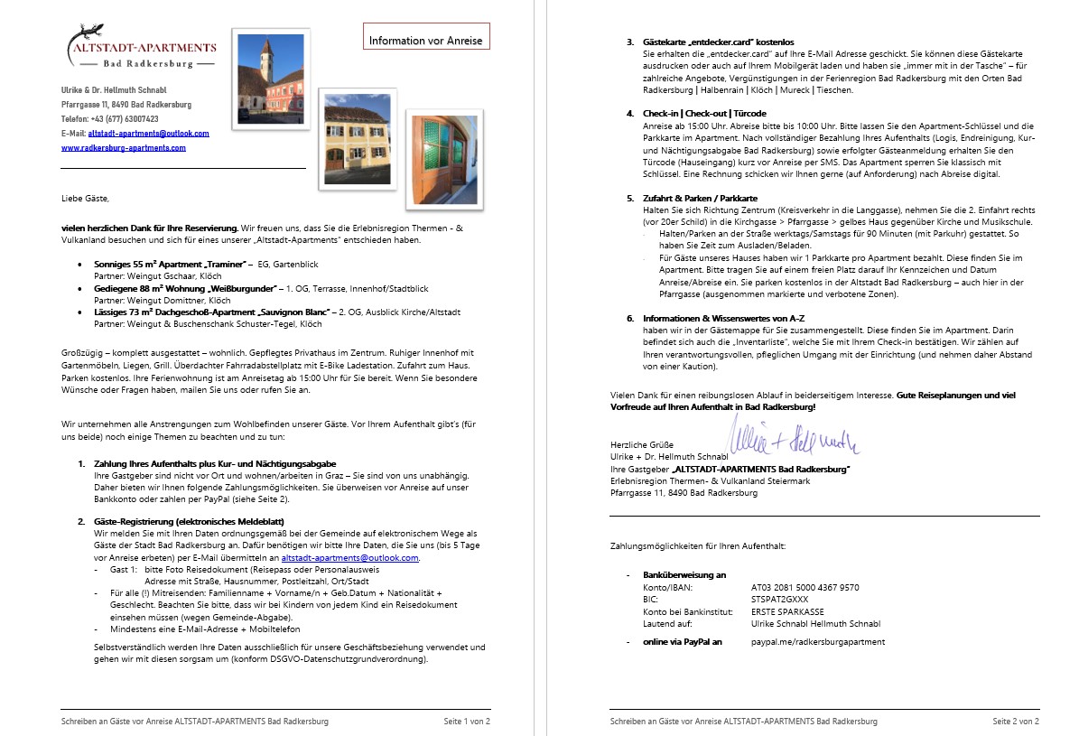 Unser Beherbergungsvertrag kommt mündlich oder schriftlich zustande. Mit Erhalt unserer Bestätigung (mündlich oder schriftlich) gilt Ihre Buchung als verbindlich und sind Sie auch zur Begleichung Ihres Aufenthalts verpflichtet. Es gelten die auf unserer Haupt-Website "radkersburg-apartments.com" veröffentlichten Stornobedingungen/Buchungsbedingungen.